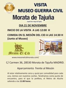 Queridos Socios Compañeros y Amigos, adjuntamos cartel de la visita-comida programada al Museo de la Guerra Civil, Morata de Tajuña, el miércoles 21 de noviembre Museo de la Guerra Civil en Morata de Tajuña. Los datos referentes a éste museo y contenido los podemos ver en — YouTube —: “Museo de la Guerra Civil en Morata de Tajuña”, Batalla del Jarama. …