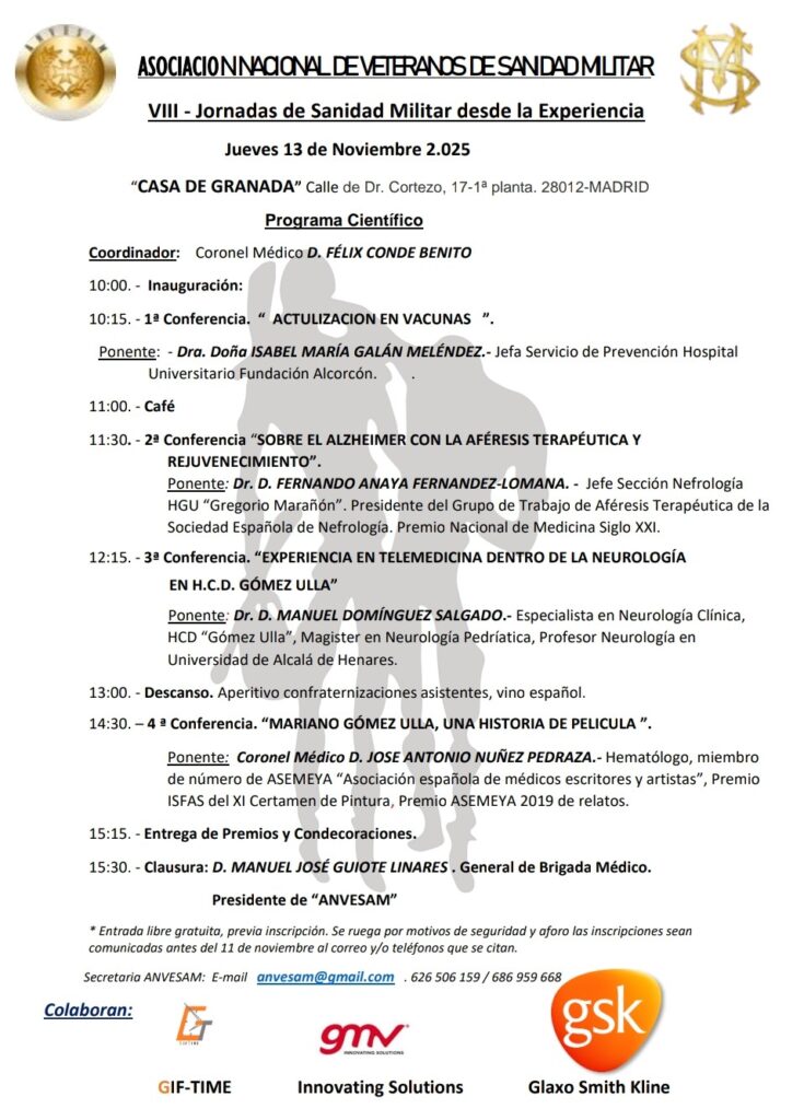 Adjuntamos programa de las “VIII JORNADAS DE SANIDAD MILITAR DESDE LA EXPERIENCIA”, que tendrán lugar el próximo 13 de Noviembre desde las 10:00 horas, en el Salón de Actos de la “Casa de Granada”, calle Dr. Cortezo 17-1ª pta, 28012-MADRID Metro-Linea 1, estación Tirso de Molina.